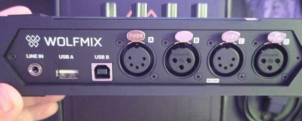 - Разъём WLINK (5-pin XLR) — для связи двух контроллеров Wolfmix или подключения внешних DMX-фейдеров
