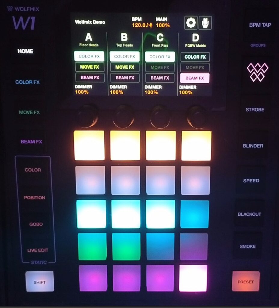 - Матрица кнопок (Matrix) — 5 рядов кнопок с RGB-подсветкой для управления группами и эффектами